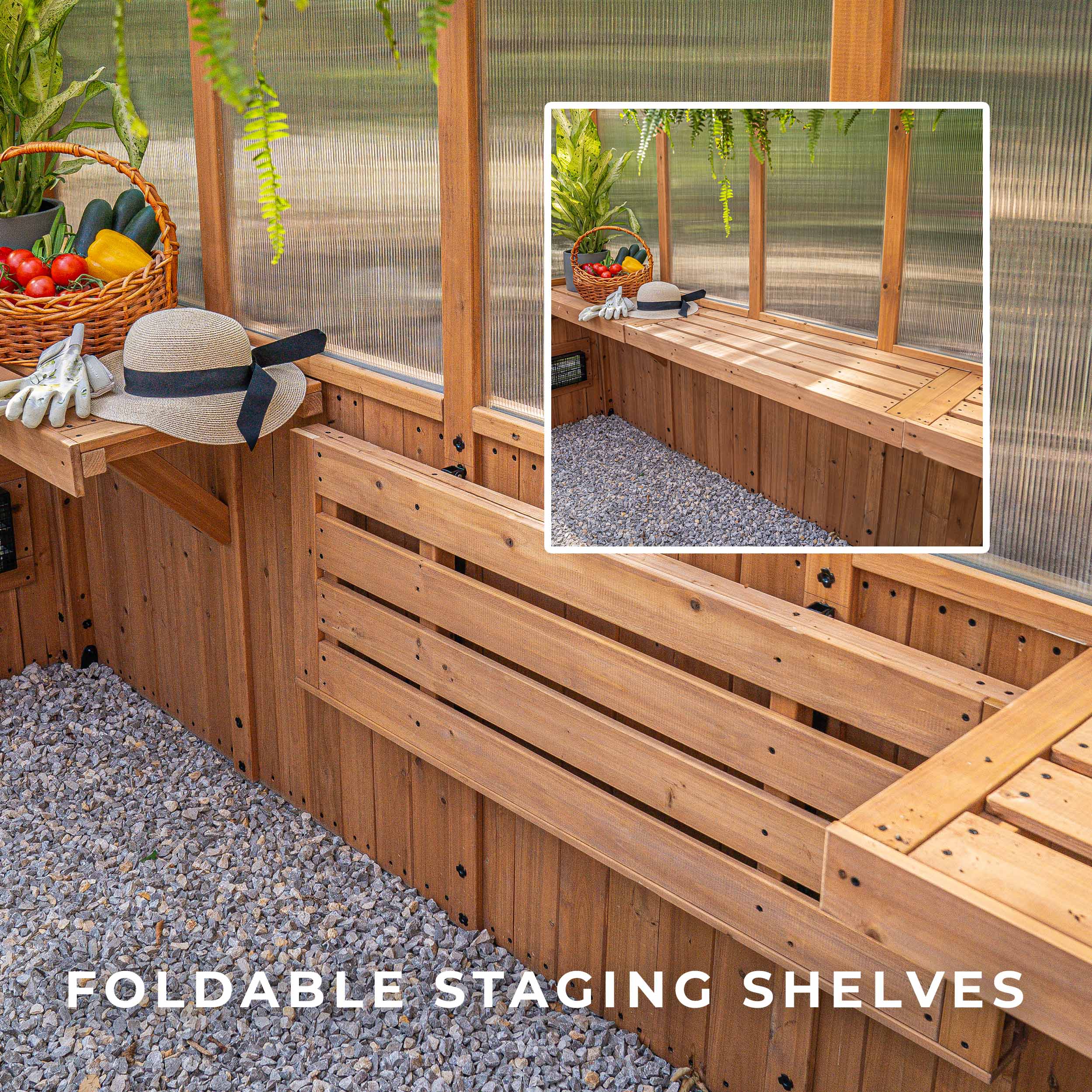 With cedar wood, a strong roof, our patented PowerPort™, and an array of useful features, this greenhouse combines the best materials with thoughtful design.