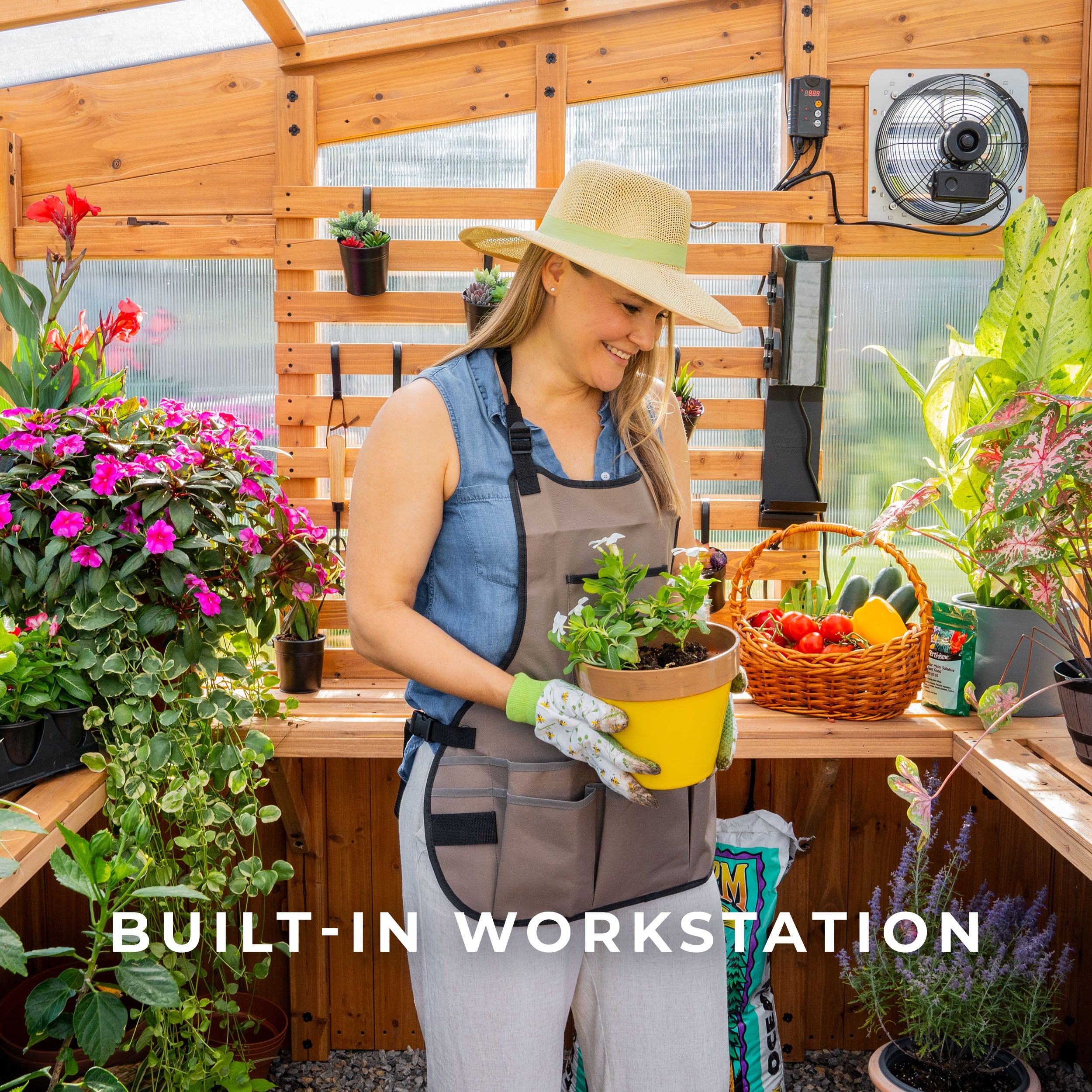 With cedar wood, a strong roof, our patented PowerPort™, and an array of useful features, this greenhouse combines the best materials with thoughtful design.