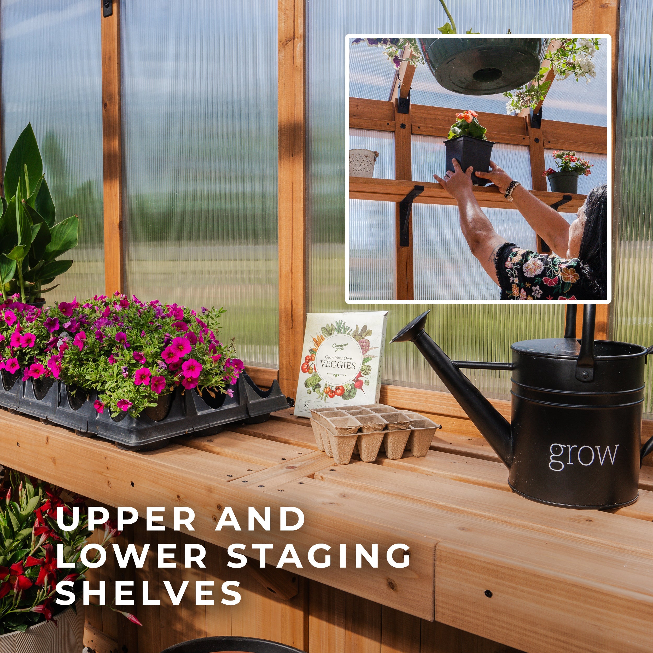 With cedar wood, a strong roof, and an array of useful features, this greenhouse combines the best materials with thoughtful design.