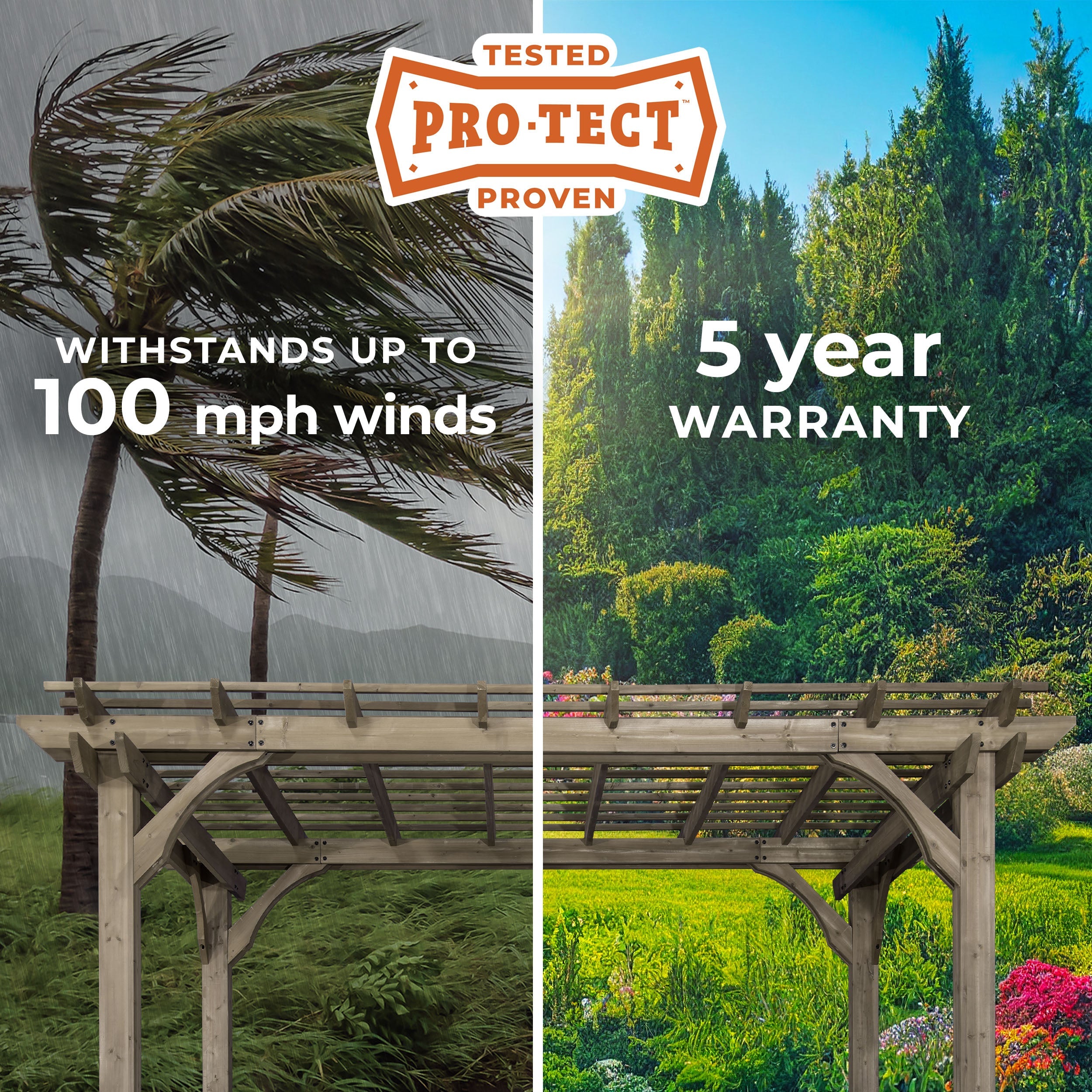 Our pergolas are tested to withstand wind up to 100 mph when anchored as directed. That means you can trust your pergola will be safe and secure in hurricane-force winds.