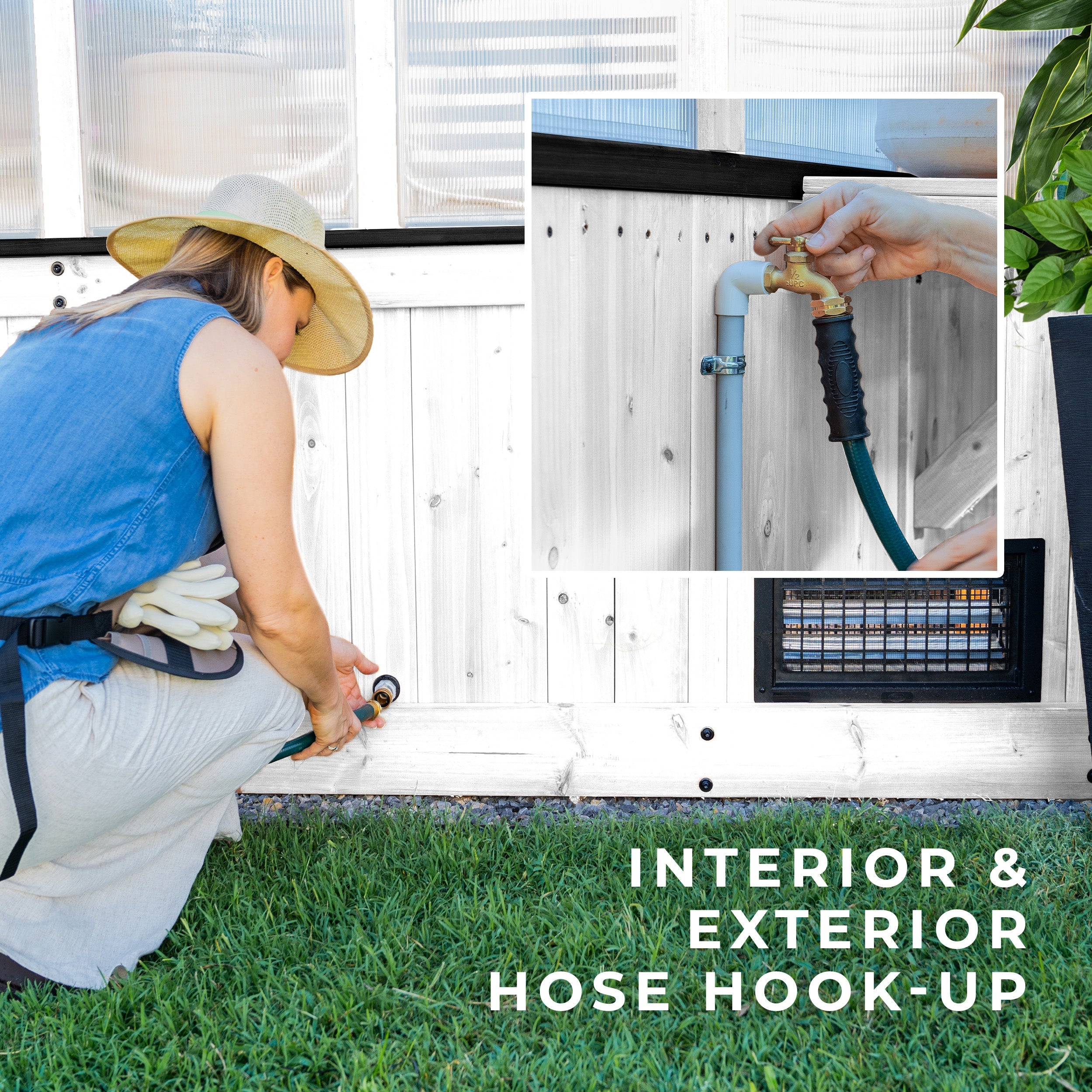- Convenient Watering: Features both exterior and interior hose hook-ups to easily water and nurture your plants from seedlings to full bloom