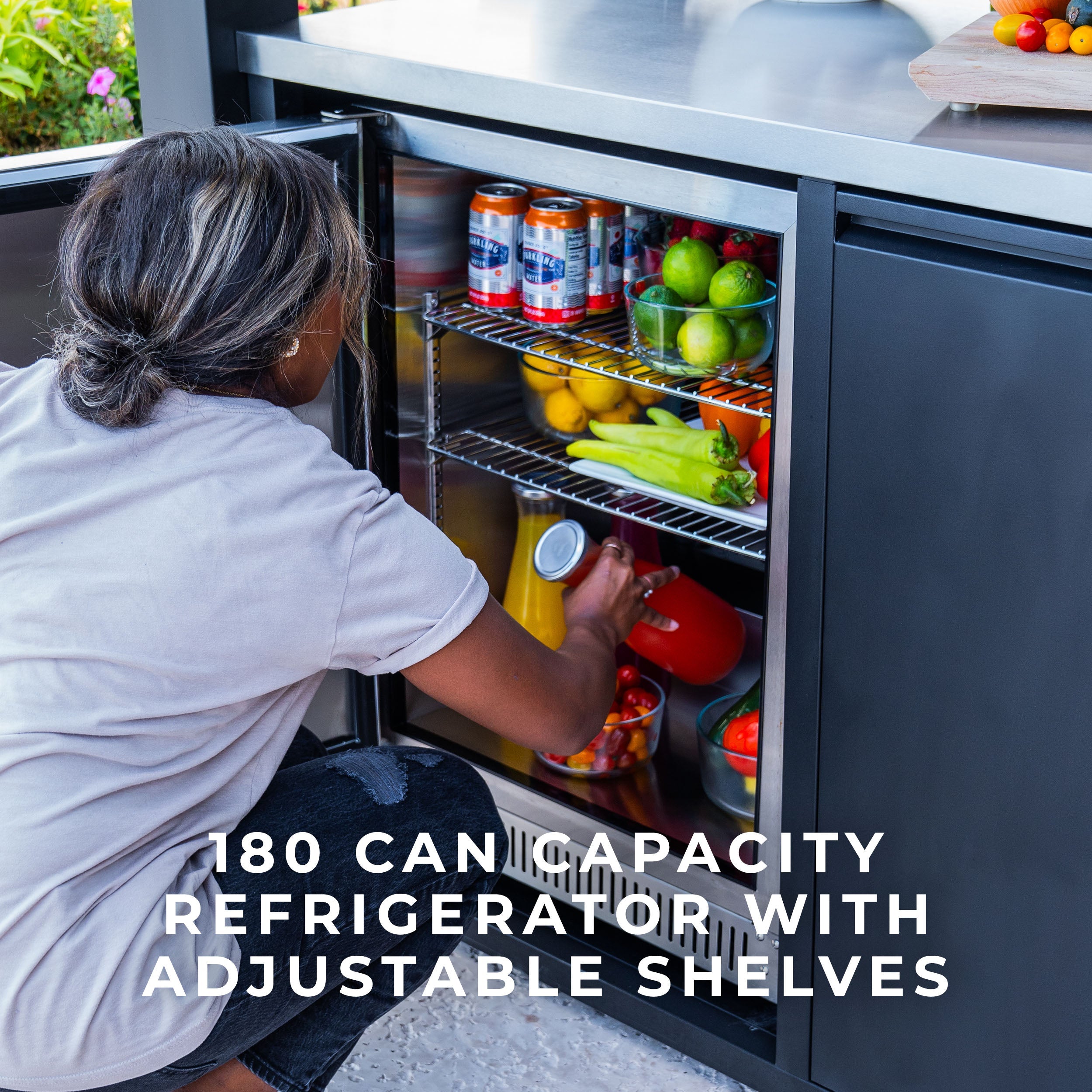 - Outdoor-Rated Refrigerator: 304 stainless steel construction withstands temperatures over 100 °F and features a 23″ design, LED interior light, and single-zone 3-layer storage offering 5.3 cu ft of space for up to 180 cans