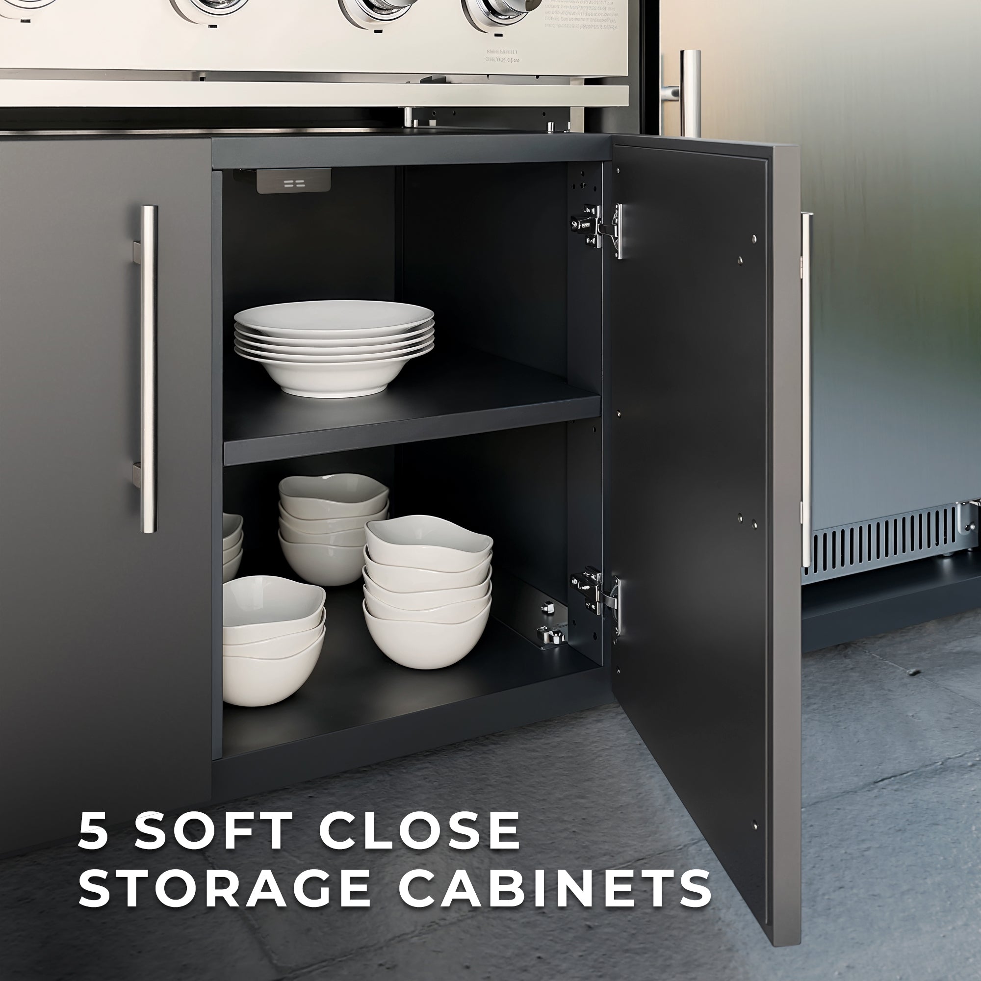 - Integrated Storage: 3 drawers and 5 cabinets with soft-close hardware organize cooking essentials